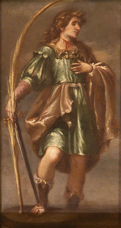 The Virgin of the Carmelites is an image that was an often repeated theme for the painters of that time; we recall the famous picture of the Virgen de las Cuevas con Cartujos that Zurbarán painted for Seville. The Virgin, in this case, is dressed in the Carmelite habit with its ample protective scapular. She presents herself to us with the arms extended on both sides in a motherly blessing to her children, the Carmelites, while two angels float (putti) holding open the white Carmelite mantle, fastened above her chest with a very beautiful broach which is the shield of the Carmelite Order; another two angels crown the Virgin Mother, at the same time carrying branches of roses and lilies (azucenas), the traditional Marian symbols. Under the flowing mantle, she welcomes members of the Carmelite Order with its two versions: masculine and feminine. The figures are not identifiable but only symbolic: five men among whom are a pope and a bishop, possible Carmelite saints, and six nuns, one of which carries as symbols of consecrated life a book (sometimes a Bible, the Word) and a palm for martyrdom. The whimple of the nuns is that which was typically used in the 17th century. A face in the shadows between the first two nuns is barely visible at first glance—bringing the total to six nuns. All of the Carmelites are in prayer while the one to the extreme right, the one who carries the symbols, is placing her hand over her heart, a gesture recalling contemplative life, living in the heart itself of the Church. . . . 2 = St. Acisclus, martyr
