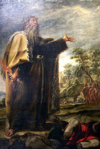 The iconographic representation of Elija and the Prophets of Baal was inspired by the Book of Kings (1 Kgs 18:20-40), a selection that tells of the confrontation that Elijah had before the people of Israel with the false prophet of Baal, to proclaim the superiority of Yahweh over all other gods. This comes from a passage of the Bible that is very difficult to get across in a painting. The figure of Elijah is truly great and noble, solemnly, unusual to think that it is telling the story of a truly violent and provocative situation.