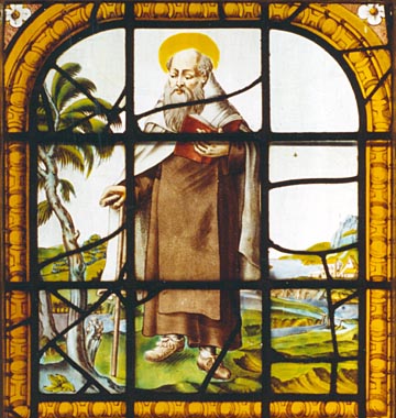 Middle Section In the window, Elisha is portrayed in the Carmelite habit, with a staff in his hand, standing near a tree with one of its branches cut off. The staff of Elisha had healing power (2 Kgs 4:29) and the cut off branch relates to the miraculous finding of a lost axe (2 Kgs 6:1-7). Elisha is usually depicted as a prophet with a bald head because the biblical story recalls some small boys calling him "old baldpate" (2 Kg 2:23-24). |
